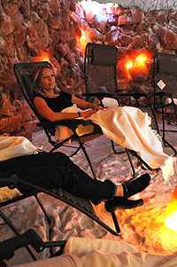 Unterstrichen wird die besondere Atmosphäre durch hinterleuchtetes Salz, leiser Entspannungsmusik und einem wechselnden Sternenhimmel der steuerbaren Salzgrottenbeleuchtung nach der Colortherapie.